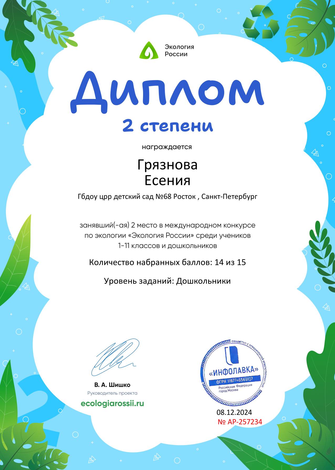 - Международный конкурс по экологии "Экология России", 2 место, 2024 год (диплом)